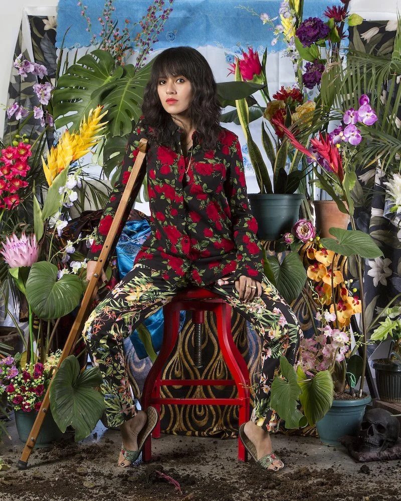 Wawi Navarroza, I Want To Live A Thousand More Years (Self-Portrait After Dengue, with tropical plants and fake flowers), 2016, archival pigment print on Hahnemühle, cold-mounted on acid-free aluminum, with artistʼs exhibition frame i.e. double wood frame custom-tinted to WN skin, 127 x 101.6cm. Image courtesy of the artist and Silverlens Galleries.