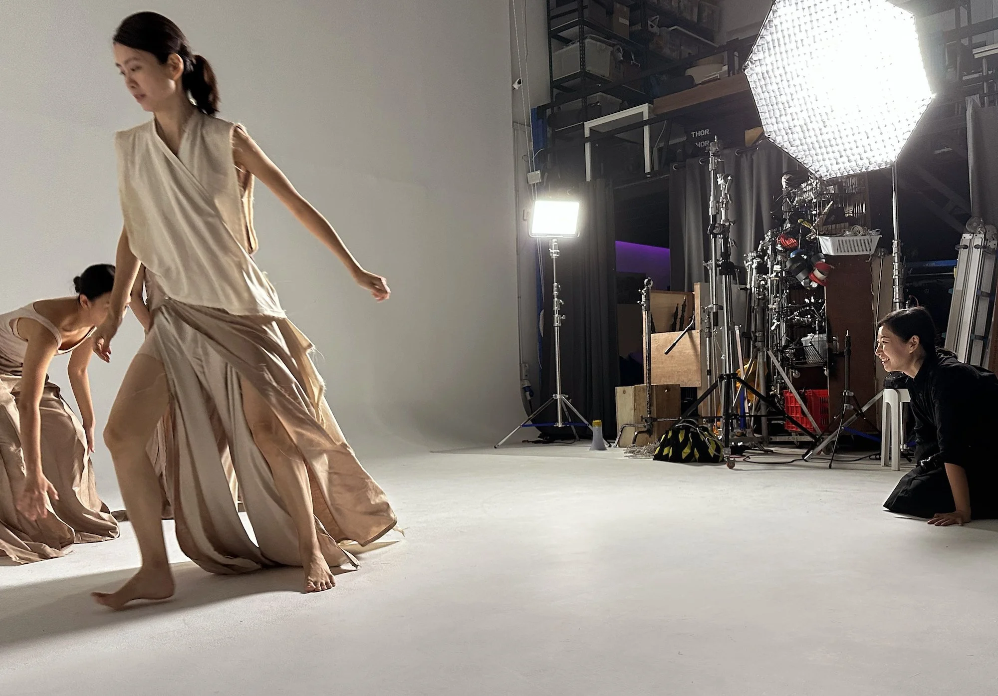 Here, I am rehearsing the choreography in the studio with my collaborators Caroline Chin, Kyongsu Kathy Han and Weiying Tan, who are all trained in theatre and dance. I particularly valued their intercultural training, which immersed them in different Asian traditional performing art forms.