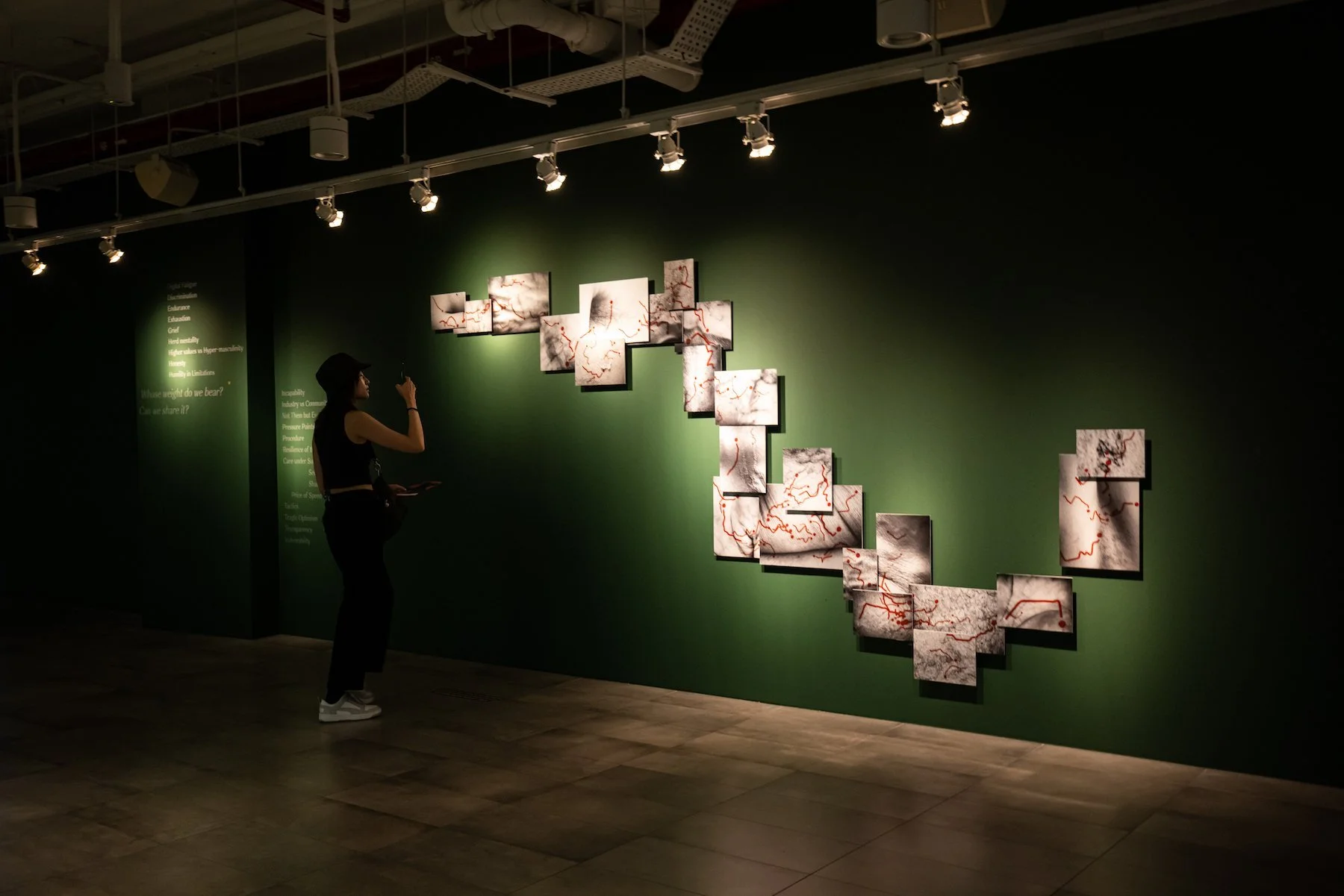 As part of the installation, there are two sets of photographic prints that features movement scores. They follow the journey of red line graphs flowing across a terrain of human skins. The red line graphs are derived from real-life data on topics related to the provision of care. I was first drawn to these line graphs when I was researching refugee numbers and the conditions of their movements across different geographies during a digital residency with In Transit Space.