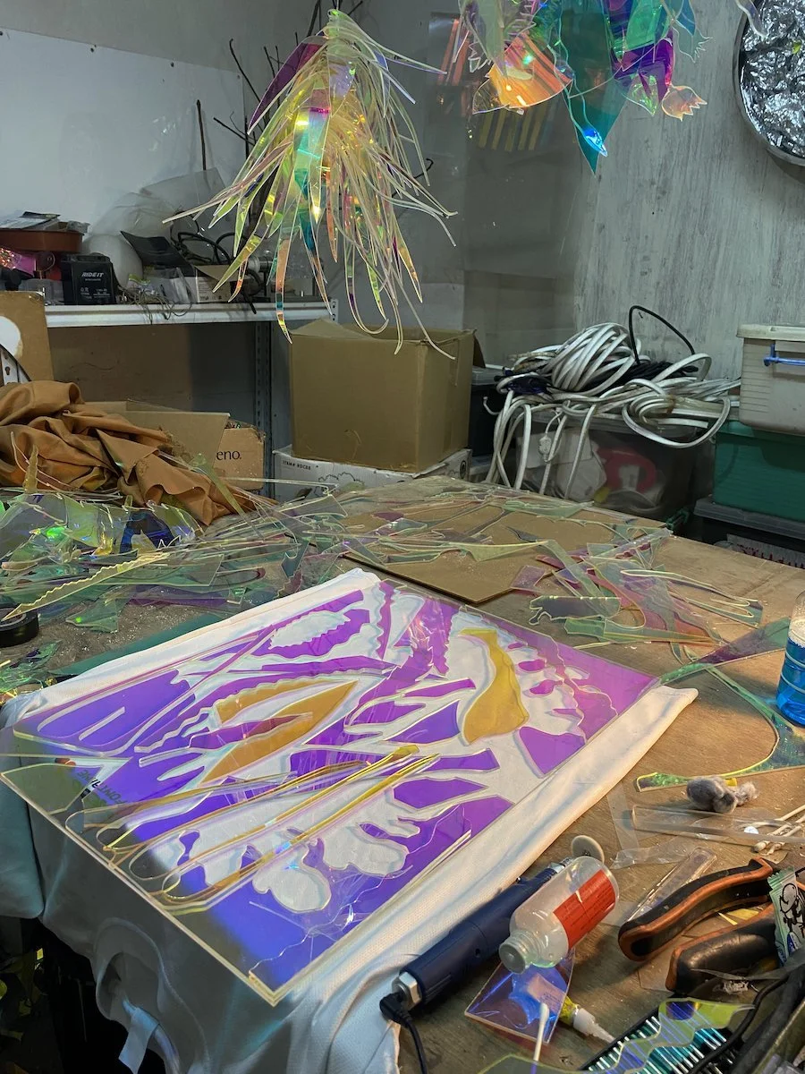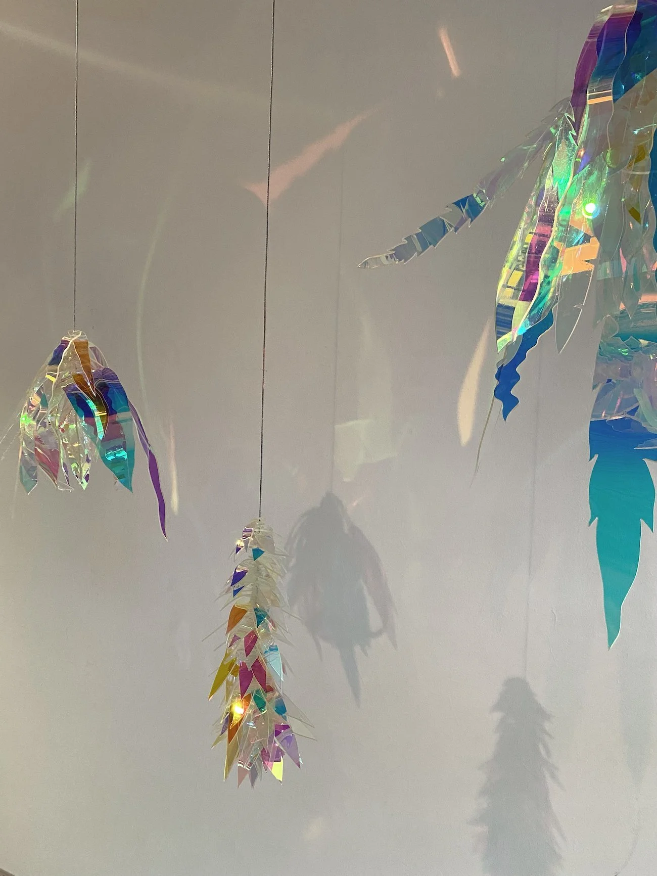 I use dichroic film, which creates a translucent, ever-ambiguous appearance that changes colour at every turn. For me, this material is transformative and always becoming, a trait that I relate to my creative process.