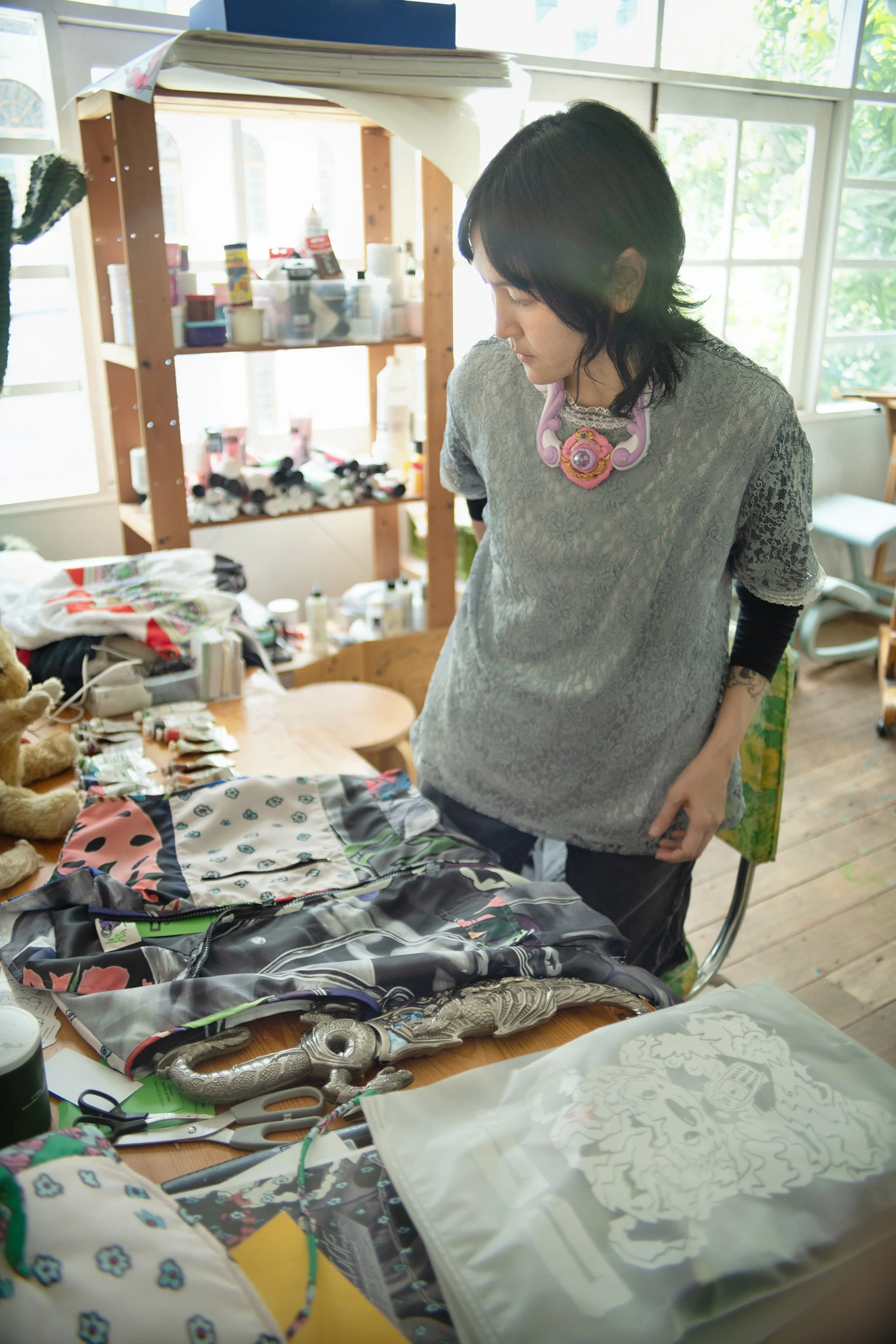 Chanida in the studio, working on a vest made from recycled fabric. Photo by Akkarawin Krairiksh. Image courtesy of the artist and BANGKOK CITYCITY GALLERY.