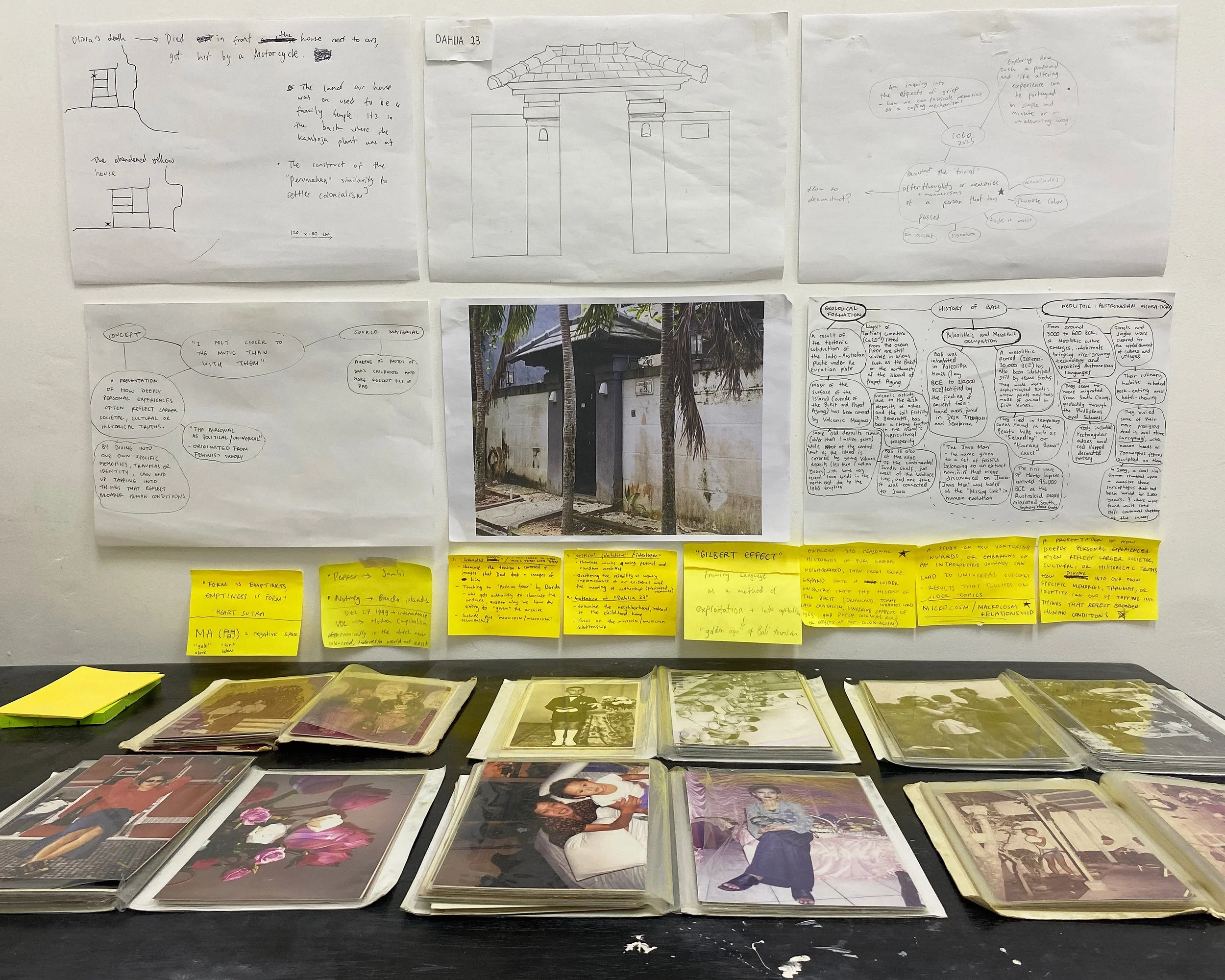 A section of my desk, with notes, sketches, and photographs laid out. The photographic albums are central to my process, combining personal and found archives. The family photos were inherited from my late father, who was often behind the camera, documenting moments that now form the foundation of my practice.