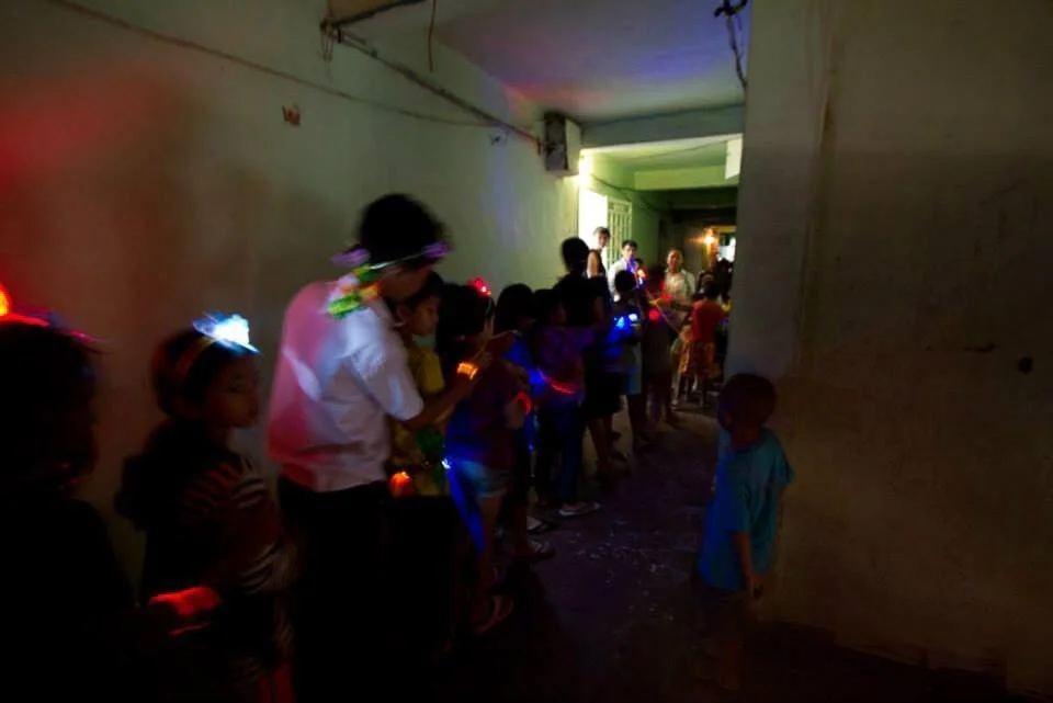 Artist Clare McCracken's LED workshop with young students of AZIZA school, conducted as part of Sa Sa Art Project's Pisaot residency in the White Building. Image courtesy of Sa Sa Art Projects.