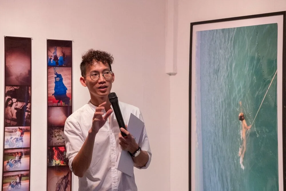 Sa Sa Art Projects artistic director Lyno Vuth speaking at the opening of Interface (2020), an exhibition by XEM collective. Image courtesy of Sa Sa Art Projects.