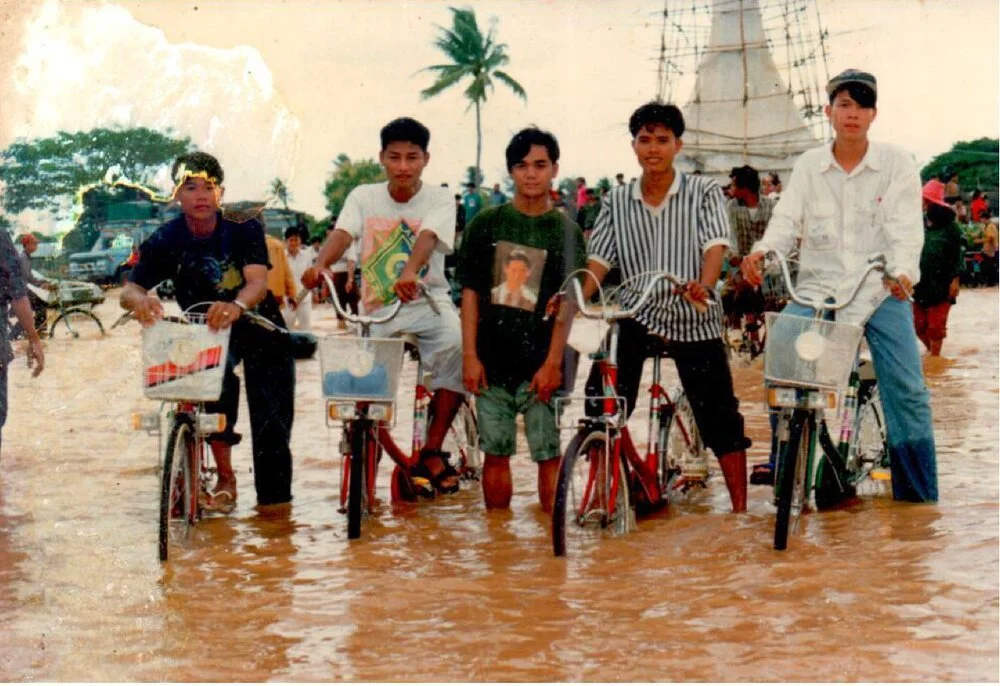 Archival photo of Phare Ponleu Selpak co-founders taken in 1994 during a flood in Battambang. Image courtesy of Phare Ponleu Selpak.