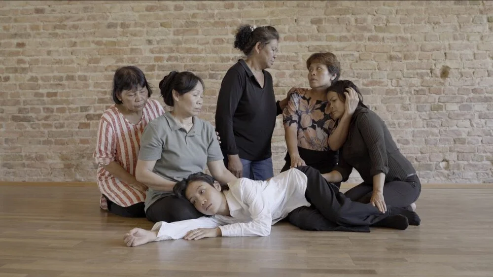Further interrogating the phenomena of cultural silence is Arin Rungjang, who exhibits a 7-channel video work titled Ravisara (2019). Through these video works, Rungjang presents an intimate portrait of six women who have emigrated to Germany from different parts of Thailand. During his stay in Berlin in 2018, the artist devoted himself to the Thai community, collecting stories of migration, violence, discrimination, loss, and abuse of power. In his video installation, those stories are unraveled, as the women appear on their own, sometimes with others in close-ups, and other times as a group of six, with limbs draped over each other's shoulders. In each configuration, the women utilise their bodies as a form of speech. The intimate atmosphere generated by their bodily presence presents a stark contrast to the harsh, systematic, and policy-oriented language used to describe migration. Here, performative gestures become a language that reflects the intense and physiological memory of migration. Through movement, Thai immigrant women rely on body memory to recall stories that reflect the arduous journey of finding a new, personal identity in new conditions that are influenced by postcolonial power structures and prescribed gender roles. This practice of active remembering through embodied memory functions as a tool to reconnect with the most intimate and visceral experiences of the self. In emphasising the role of body and gesture in storytelling, Rungjang reinvents documentary modes of representation by creating a silent space to position the personal and the embodied memory within the global discourse on migration.