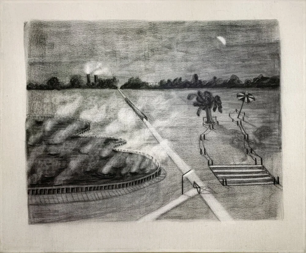 Ella Wijt, New View of a Future Dream, 2021, charcoal on raw canvas, 100 x 120cm. Image courtesy of Art Agenda, JKT.
