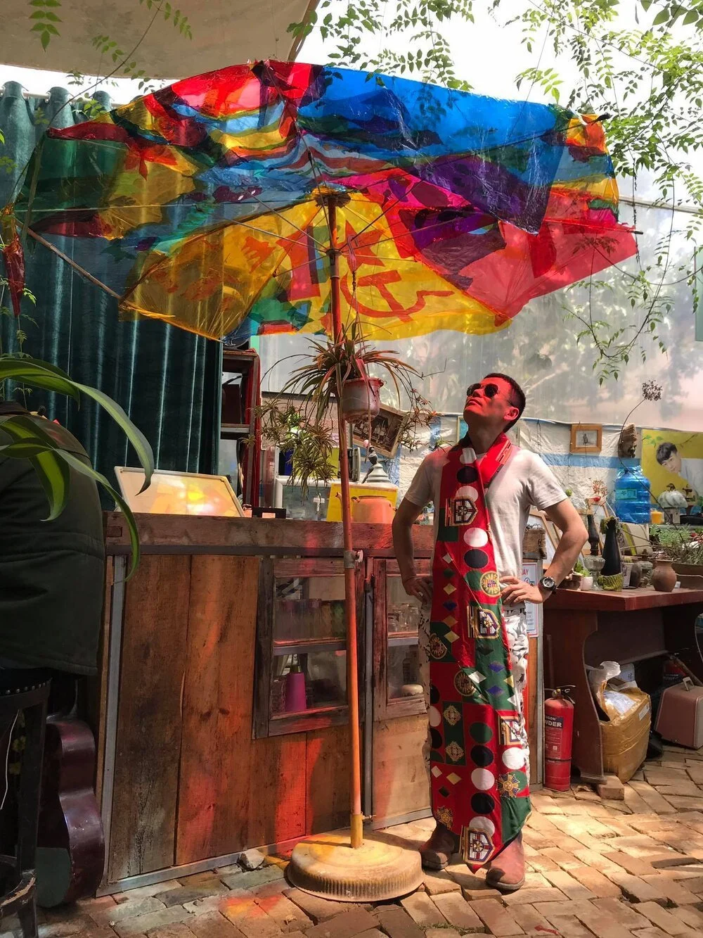 In NCB 2020, the fear appeared in facing the installation Nghệ Thuật Vạn Tuế! (Art Forever!) by artists Nguyễn Đức Đạt and Laurent Serpe. The object installation performance was inspired from the widely seen worshipping and votive offerings in town. Coming from this area, the artists found these customs touching. Besides, the market for the dead offered everything except art supplies. Within two weeks, an artist studio was built from colour paper, papier-mâché and cardboard. The craftsmanship was not made by casual craftsmen because of high-cost restrictions, but rather for want of a lesser quality. The artists specified that the votive offerings must be real as it would be truly needed in another world. Thinking in English, the work Art Forever! is a tease on what comes next after Art Now – a trendy name for books on contemporary art. Likewise in Vietnamese, ‘Nghệ Thuật Vạn Tuế’ is a play on common political slogans in the country. All of these offerings and objects were set up for a week and burnt on the ground of Hue College of Arts on the final day of the art week. Before burning them, the artist and friends brought in fruits, flowers and burnt the incense for worshipping. Đạt was sentimental as he reflected on other deceased artist friends and his own mortality as the objects vanished in the fire. The artist shared that “it was fun to do something invaluable and nonsensical” when speaking about the non-commercial artwork.⁸