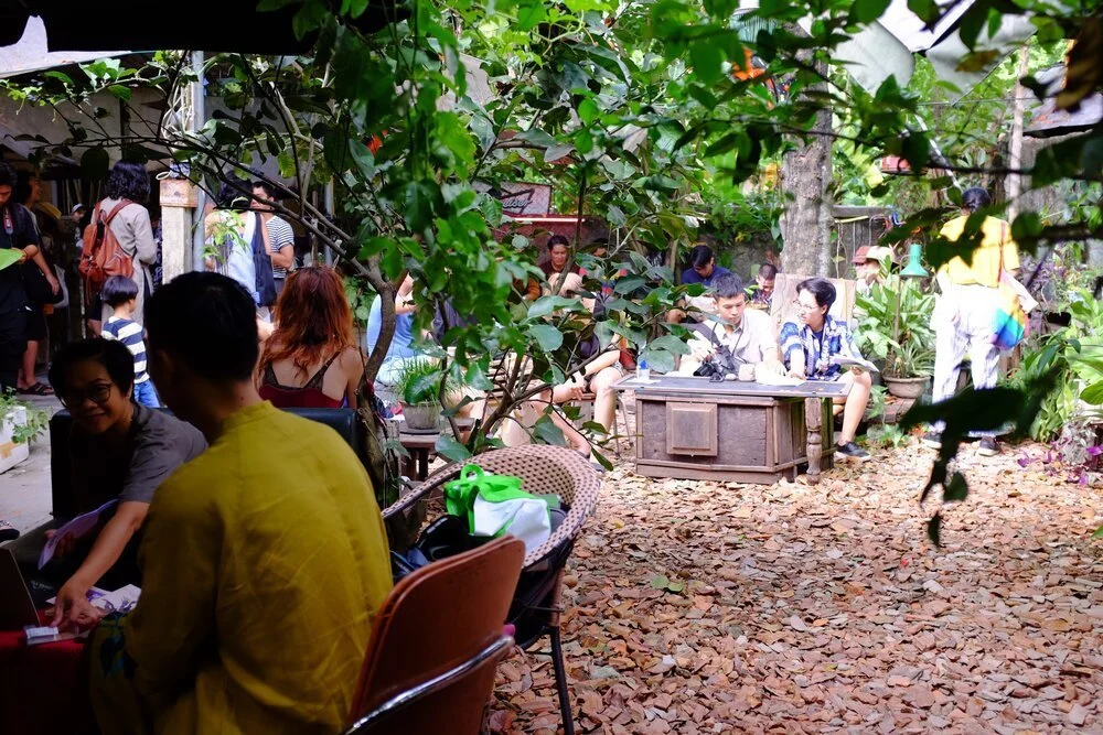Mơ Đơ is a loose artist collective founded as a wine bar in a junky garden in the formal imperial citadel by Huế-based artists Trương Thiện, Hoàng Ngọc Tú and Nguyễn Thị Thanh Mai, and Phương Linh from Hanoi. The artist bar opened for film screenings and art events besides selling drinks. Nearby, Nest Studio is a combination of artist studios and room rentals founded by artists Đào Tùng and Ngô Đình Bảo Châu in 2019. Besides its resident capacity, Nest Studio also includes artist gatherings, talks, film screenings and art events. Likewise, Symbioses is an art project initiated by curator Lê Thiên Bảo. Interested in the relation between arts and business, Thiên Bảo wants to create a connection between the art world and local enterprises. Via Symbioses, she aims to bring art to casual spaces and to change people’s habits towards appreciating and collecting artworks.