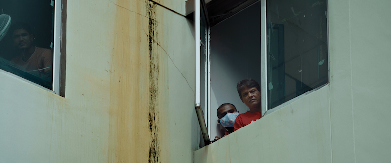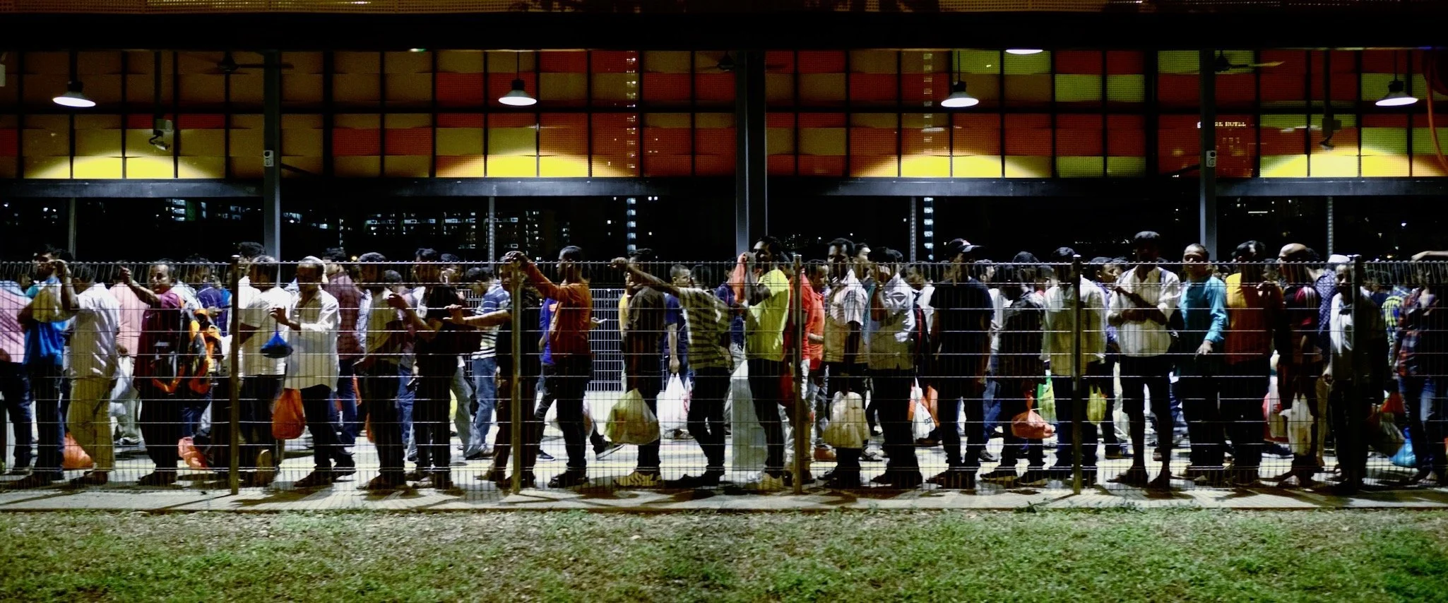Ting’s employment of a single-take video emphasises the architectural qualities of the captured bus terminal. Influenced by the Little India riot in 2013 at Race Course Road and Hampshire Road, the building is equipped with cameras, yellow queue lines, see-through fences and a group of policemen at its tail. Nothing can be hidden from view, whether from Ting’s camera or the police cars circling the area. “I feel that the work has become more salient given the harsh conditions migrant workers have been and are still subjected to,” ruminates Ting. “The building depicted in the film has been unused since the start of the pandemic, underscoring how dramatically life has changed for them.”