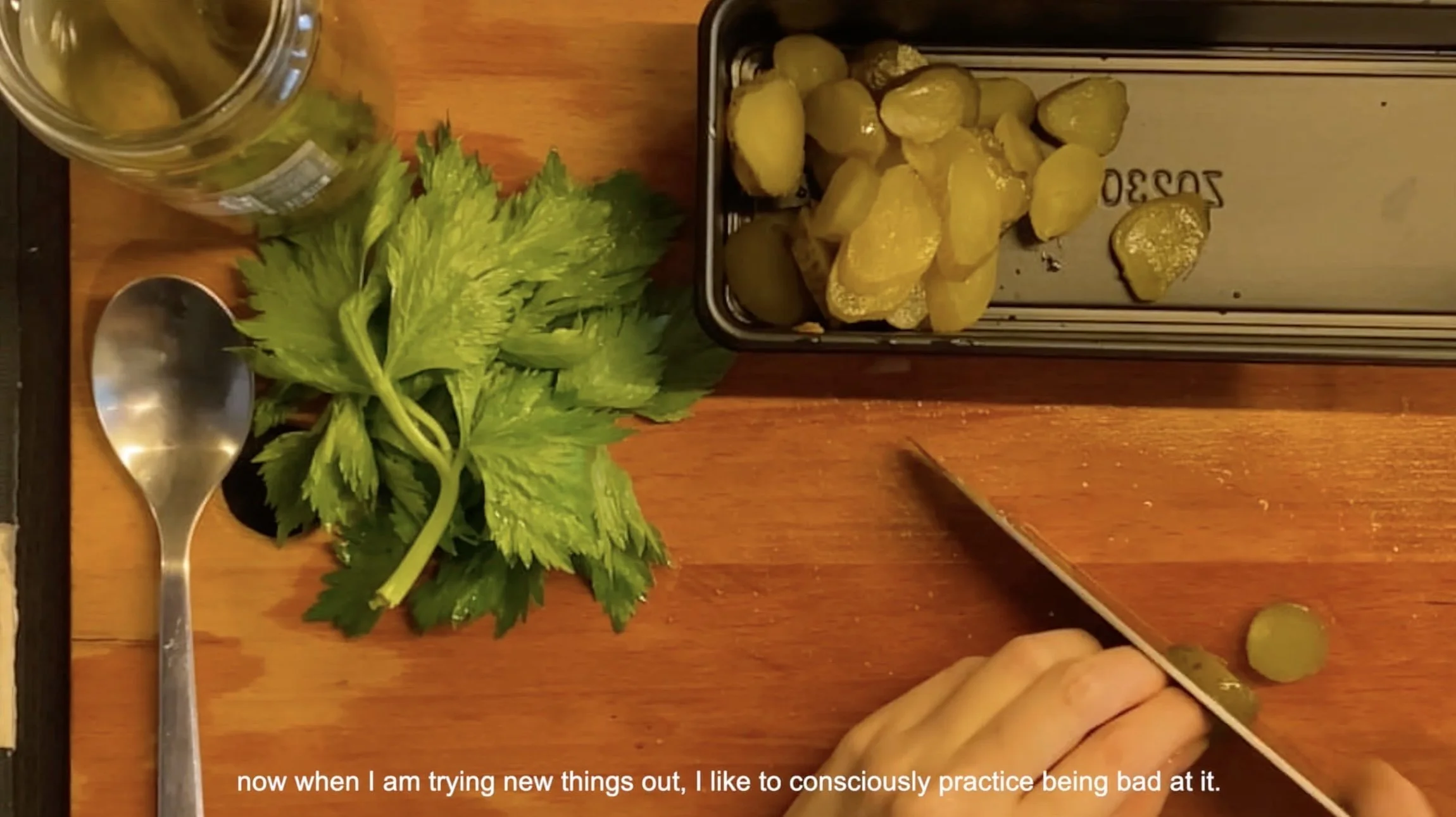 The work XxHaven_KitchenxX (2022) by Farizi Noorfauzi and Nelly Tan adds a playful twist to the format of an instructional cooking video, now popular on social media. The work celebrates nonsensical forms of knowledge and questions the idea of “bad” cooking. Without a precise recipe, hands are shown drying winter melon seeds, chopping pickles, peeling cucumber skin and more. "I was thinking about the formative aesthetics in easy DIY craft videos and internet how-tos," articulates Noorfauzi. “Our video tutorial functioned as a backdrop to our conversations about cooking, failure and braving individual fragilities.” Indeed, rather than instructional voiceovers, the video employs subtitles of these authentic conversations. They discuss illuminating thoughts, such as an idea to increase the quality of failure instead of reducing its frequency. Subverting the goal of creating a perfect meal in usual video tutorials, the work talks about the joy of making mistakes.