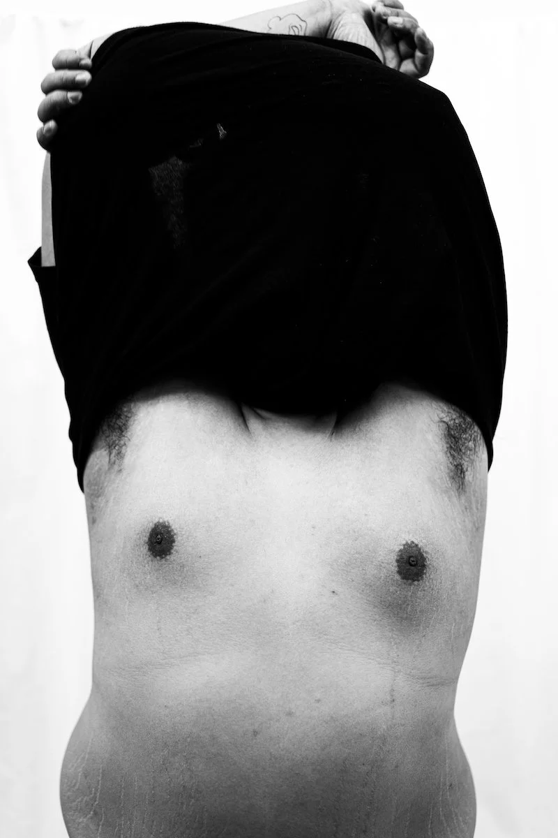 Rather than physical exposure, these black and white, chiaroscuro photographs capture a deeper, delicate kind of nakedness. One man bashfully laughs as he removes his thick rimmed glasses. Another takes off his shirt, baring his torso but covering his face. Turning his side towards the camera, another removes his underwear. In that moment, his body almost resembles a fetus: legs bent, back gracefully curved. Embracing tenderness without shame, these images offer a way to counter the performances of masculinity that have brazenly wounded our country.