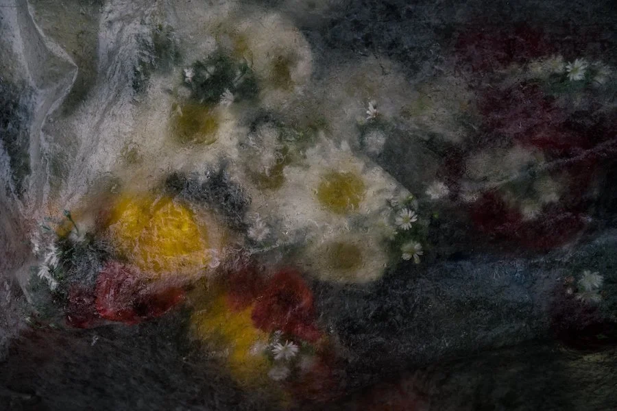 Hannah Reyes Morales, a plastic covers flowers for the dead, protecting it from the rain. Image courtesy of the artist.