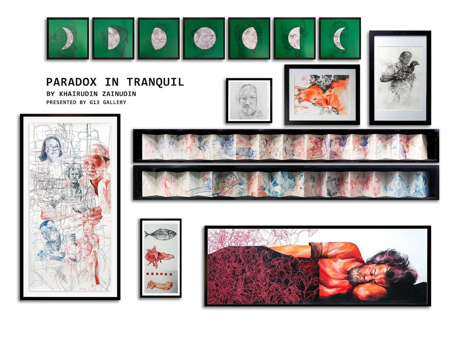 Khairudin Zainudin, Paradox In Tranquil, 2019, various dimensions, drawing on paper. Image courtesy of G13 Gallery.