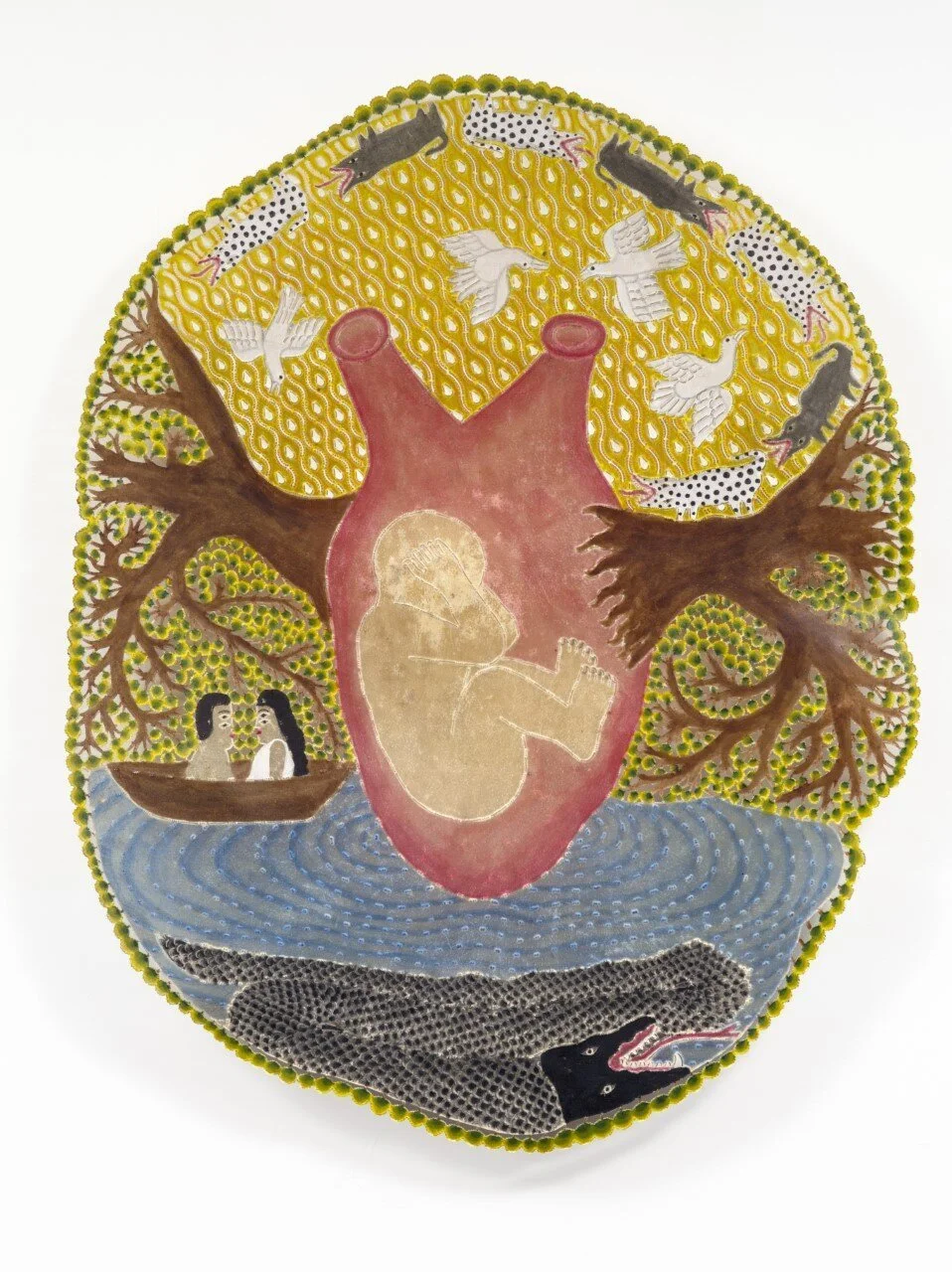 Jumaadi, If You Were the Canoe, I’d Be the River, 2018, buffalo hide with pigment, 60 x 75cm. Image courtesy of the artist and Jan Manton Art.