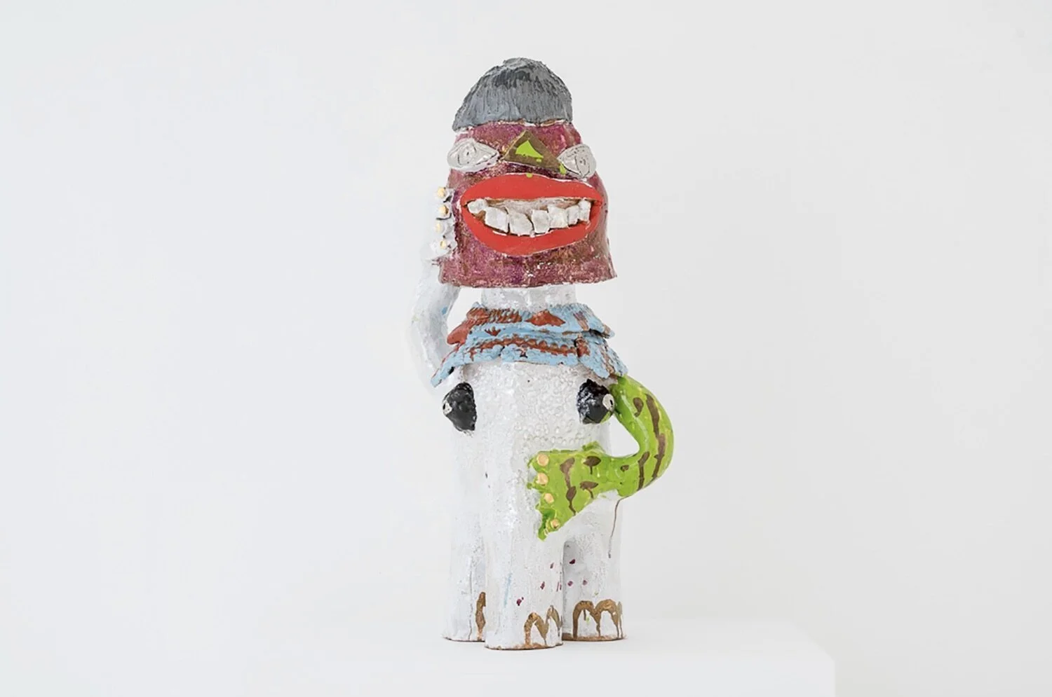 Ramesh Mario Nithiyendran, Figure with Purple Head, 2019, earthenware, glaze and lustre, 68 x 25 x 20 cm. Image courtesy of Sullivan+Strumpf, Sydney | Singapore.
