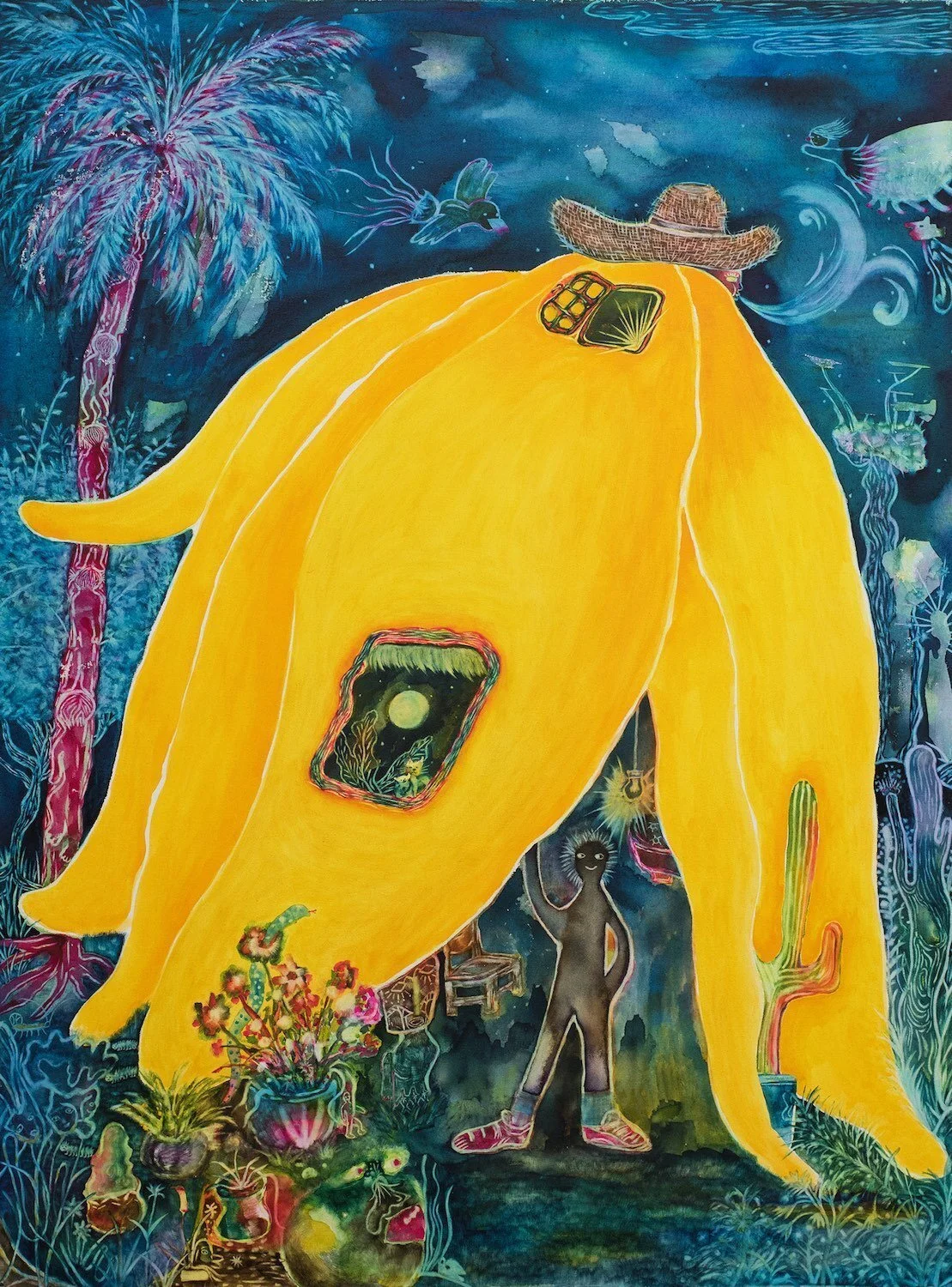 CC Kua, ‘Going Bananas I’, 2020, watercolour on canvas, 122 x 91cm. Image courtesy of The Back Room and the artist.
