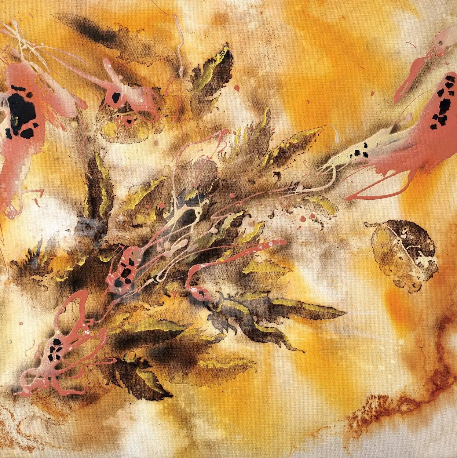 Haafiz Shahimi, Bunga Gersang V, 2020, pyrography print, inverted burn, direct petrol burn, rusted chemical wash, fabric dye and acrylic on jute, 92 x 92cm. Image courtesy of Core Design Gallery and the artist.
