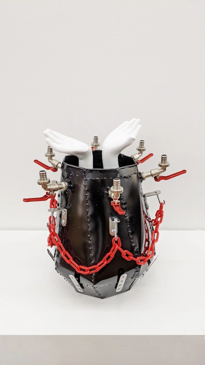 Joshua Kane Gomes, Bless Me with All My Sins II, 2020, steel, ball valve taps, mannequin hands, chain & brackets, 49 x 46 x 48cm. Image courtesy of Richard Koh Fine Art and the artist.