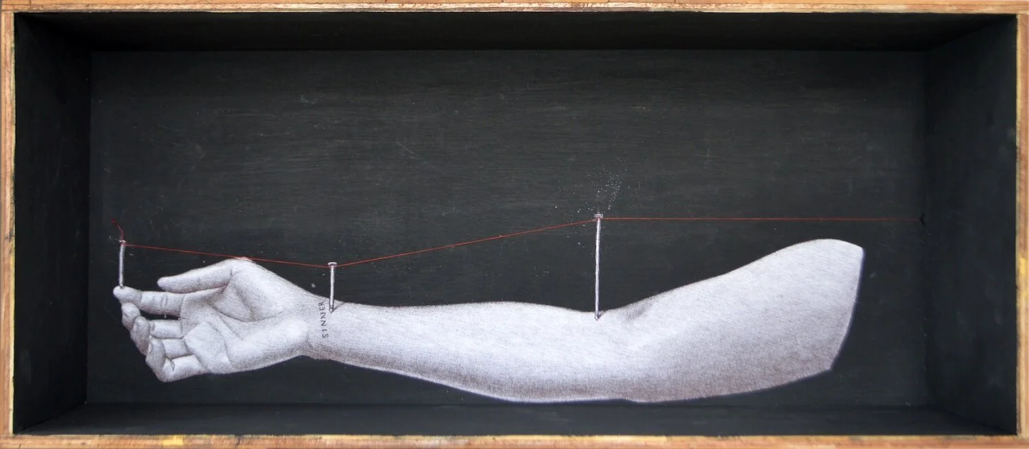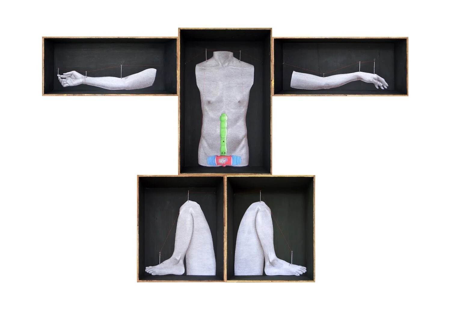 Syahbandi Samat, Un-Riveted (right arm), 2020, ballpoint pen on canvas and plywood, 31 x 71 x 20.5cm.