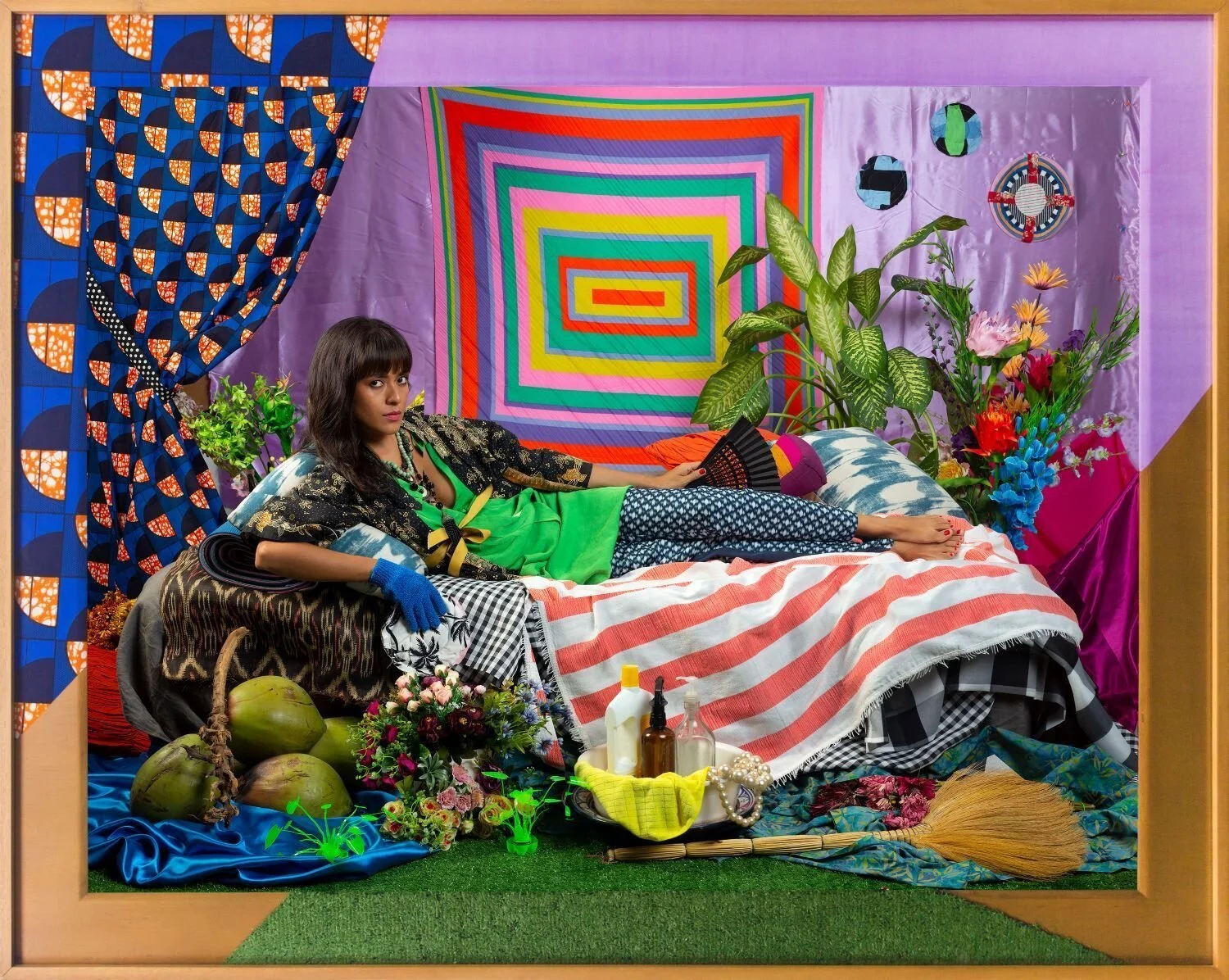 Wawi Navarroza, La Bruja (All the Places She's Gone, Self-Portrait), 2019, archival pigment print on Hahnemühle, cold-mounted on acid-free aluminum, with artistʼs exhibition frame i.e. wrapped fabric on double wood frame custom-tinted to WN skin tone, 101.6 x 133.4cm. Image courtesy of Silverlens.
