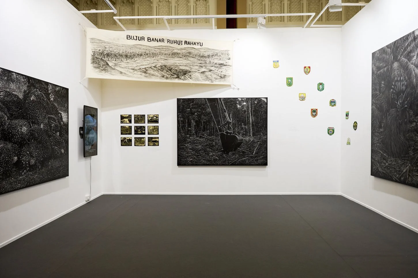 In the same section, Yeo Workshop presented the work of artist Maryanto, When the Trees Fall, which aims to bring public awareness to the overdevelopment of palm oil plantations in South Kalimantan and the detrimental effects this has on the forests. The artist says, “By turning the problems into stories that can be told and heard by many people, I can ensure that these stories do not stay hidden.” He elaborates, “My goal is to bring attention to serious problems that need to be addressed and discussed, in the hope that change is effected. I was pleased to be able to share a hidden story with fairgoers at Art Dubai.”