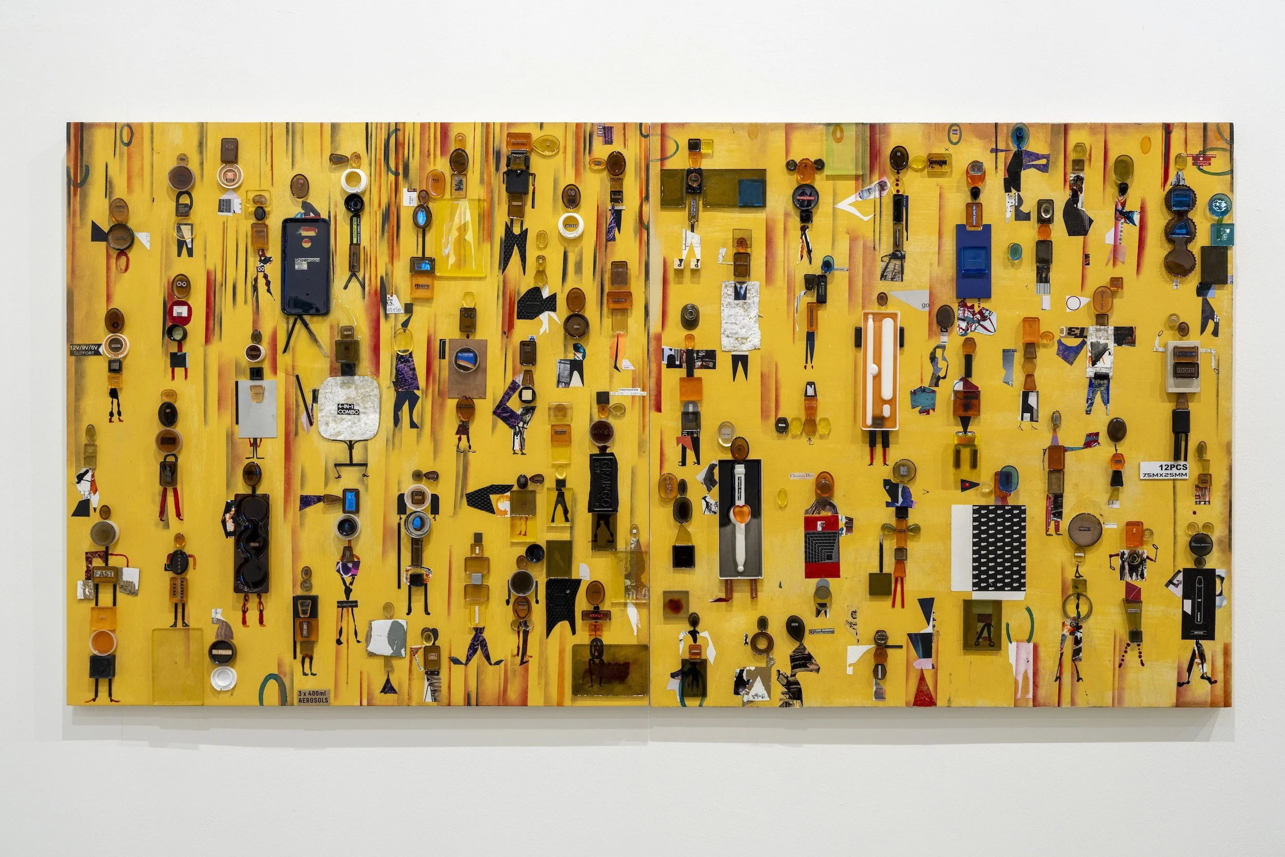 Choy Chun Wei, Crowd: Busy Bodies, 2023, wood, found packaging box (hard paper), printed typo, plastic (Lego) and cast resin, 91.5 x 183cm (diptych). Photo by Darren Soh. Image courtesy of S.E.A. Focus.