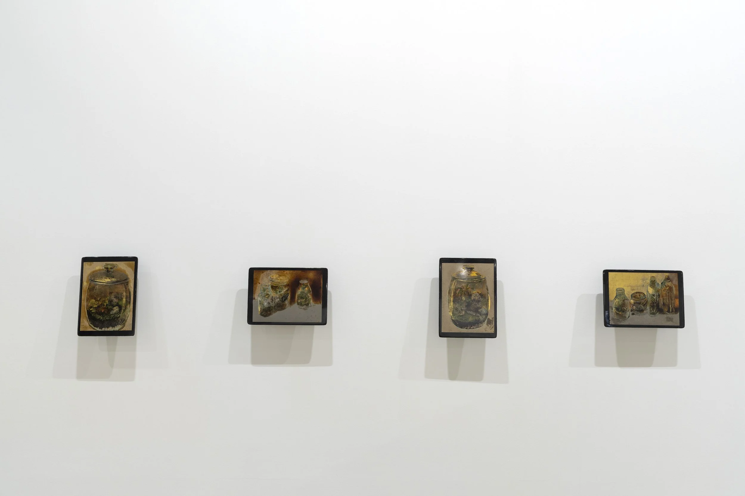 Phi Phi Oanh’s series of lacquer paintings, made by adding and subtracting layers, draws attention to life behind glass, such as in a terrarium jar or an aquarium. Collectively, they make a statement about how the earth’s atmosphere, like fragile glass, is our sole protection against external elements.