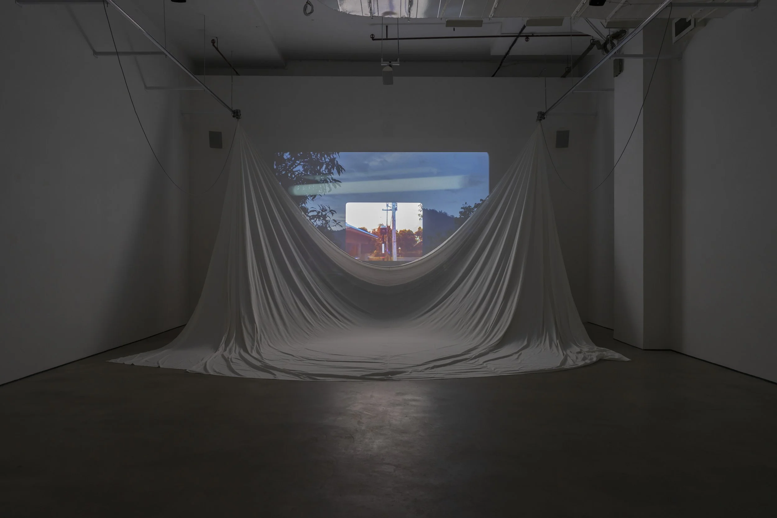 Apichatpong Weerasethakul, A Conversation with the Sun (Installation), 2022, 2-channel video randomly projected, 3-channel sound on 7 speakers, motorised fabric, infinite loop. Photo by Darren Soh. Image courtesy of S.E.A. Focus.