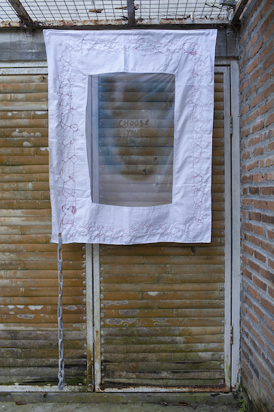 Restu Ratnaningtyas, Choose Your Fighter, 2021, polyester, cotton, thread, acrylic spray. Image courtesy of the artist and Vin Gallery.