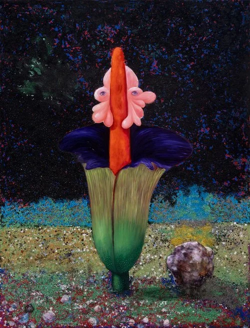 Entang Wiharso, Bunga Bangkai, 2022, acrylic and glitter on canvas, 200 x 150cm. Image courtesy of the artist and Srisasanti Gallery.