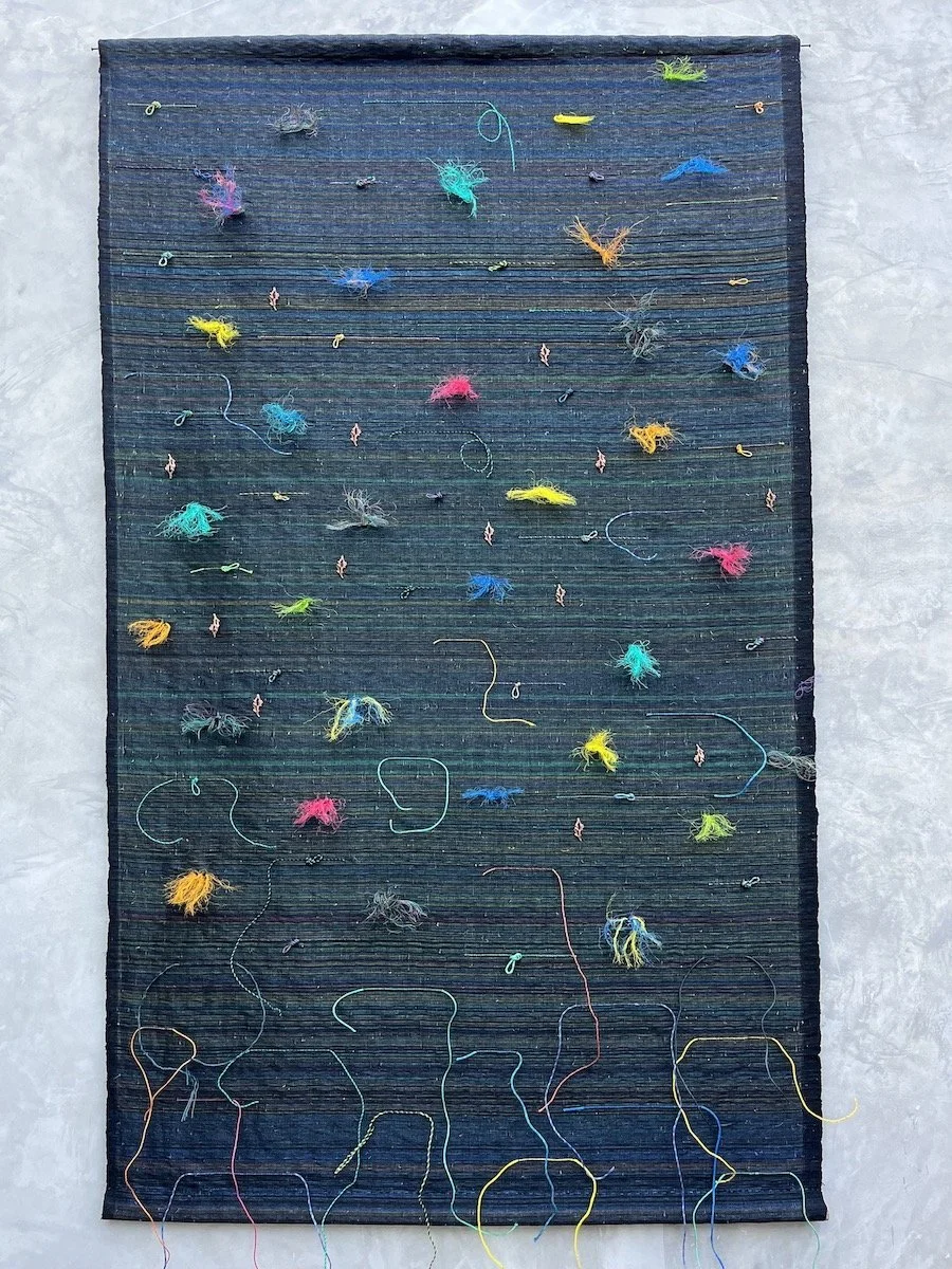 Ari Bayuaji, Waenilu Beach, 2022, woven plastic and cotton threads, plastic ropes, copper, 175 x 94 x 8cm. Image courtesy of the artist and Warin Lab Contemporary.