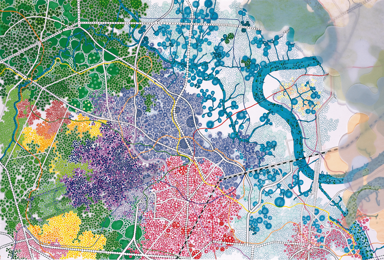 Tiffany Chung, Gò Vấp, 2008, Oil and alcohol-based markers on paper and vellum, 140 × 92 cm. Image courtesy of the artist. From The City in Time: Contemporary Art and Urban Form in Vietnam and Cambodia by Pamela N. Corey (University of Washington Press, 2021).
