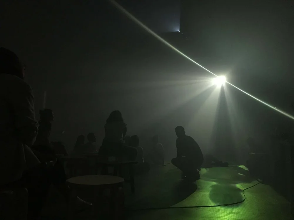 A rehearsal of Apichatpong Weerasethakul's excerpt from Fever Room for METAPHORS: AN EVENING OF SOUND AND MOVING IMAGE WITH KICK THE MACHINE at BangkokCityCity gallery.