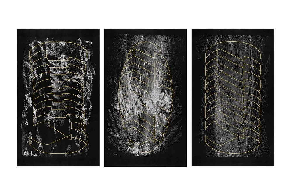 Genevieve Chua, Helix Rain, 2016, acrylic and screenprint with enamel on linen, 278 x 510cm (triptych). Collection of Museum MACAN.