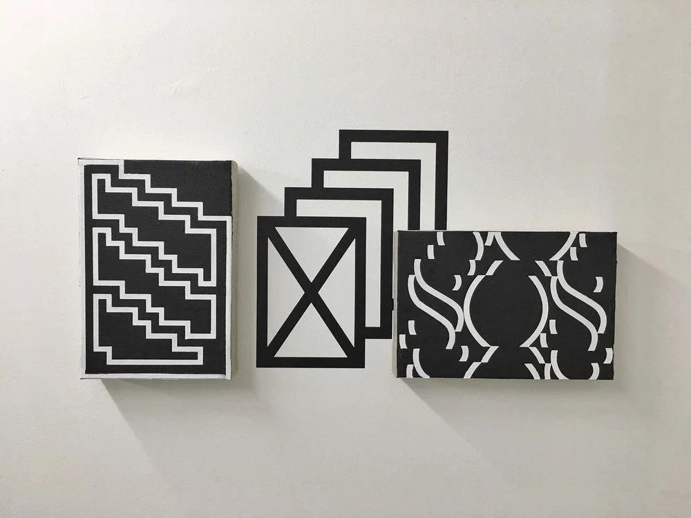 I subscribe to Briony Fer’s spectrum of labelling abstraction and my work falls comfortably as near-abstract. It refers to a figurative reality but maintains abstract examples of hard-edge, monotone and duotone. The numerical value in the titles are drily for archival purposes and a secondary title hints at a situation or an event.