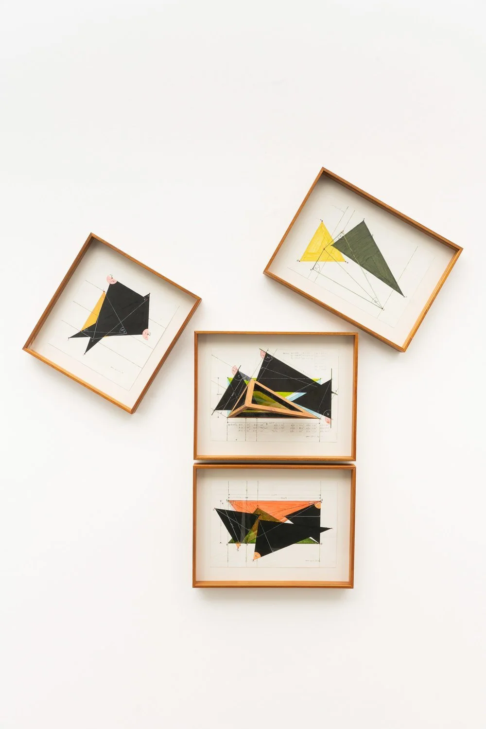 Tawatchai Puntusawasdi, Diagram For Irregular Tetrahedron, 2016, ink and watercolour on paper and teak wood, dimensions variable. Image courtesy of A+ Works of Art.