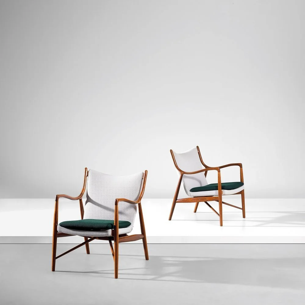 Finn Juhl, Pair of Armchairs, model no. FJ 45, designed 1945 and produced circa 1955 by Niels Vodder, Bangkok teak, fabric, leather, each 83.5 x 69.5 x 78cm. Image courtesy of Phillips.