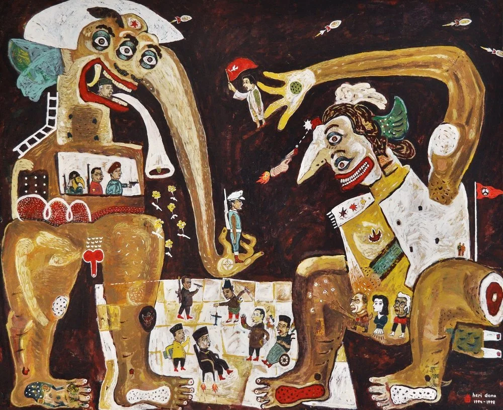Heri Dono, Bermain Catur, 1994-1998, acrylic and collage on canvas, 200 x 150cm. Image courtesy of MACAN.