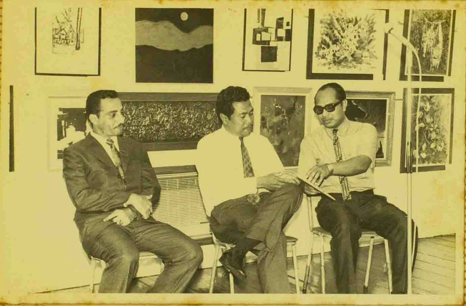 Archival image from 1971. Left to right: Hussain Aljunied (Founder of Malay Art Gallery), Mr Sha'ari Tadin (Permanent Secretary, Ministry of Culture) and Abdul Ghani Hamid (Co-Founder of APAD) officiating a group exhibition of Malay artists in 1971 at the Malay Art Gallery. Image courtesy of Hussain Aljuined’s family.