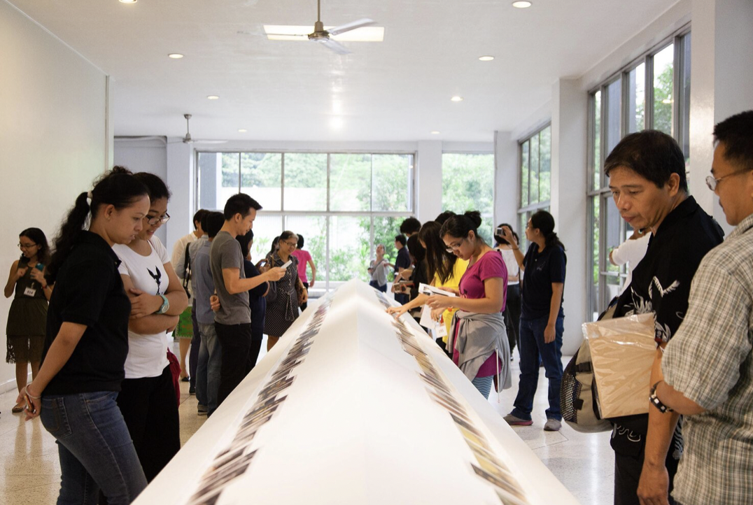 Pio Abad, The Collection of Jane Ryan & William Saunders, 2014 – ongoing, postcard reproductions of Old Master paintings sequestered from Ferdinand and Imelda Marcos and sold by Christie’s on behalf of the Philippine Commission on Good Government, 97 sets, unlimited copies. Installation view at Jorge B. Vargas Museum. Image courtesy of the artist, photo by Rachel Rillo.