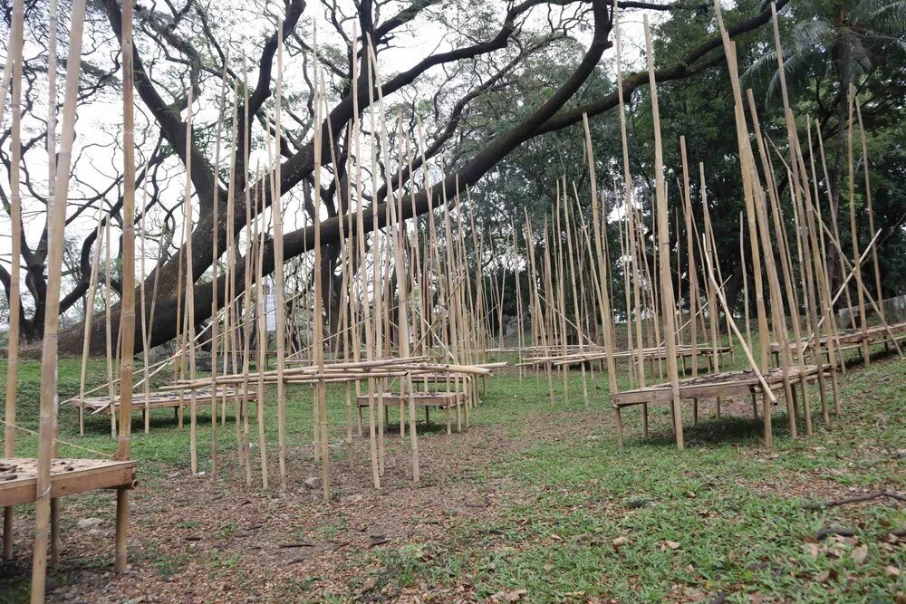 Initially, I had another idea when I sourced the bamboo materials used for this project. However, the crippling horror of the virus started entering people's consciousness and I was aware how helpless we are facing it. As I said in an article with the Inquirer, Kwarantin was intended as an interactive installation with viewers being provided with flashlights to place around and under the bamboo structures. The work deals with how our fears put us in quarantine, dreading the possibility that we might be the next patients. It is a universal feeling shared by the whole world.