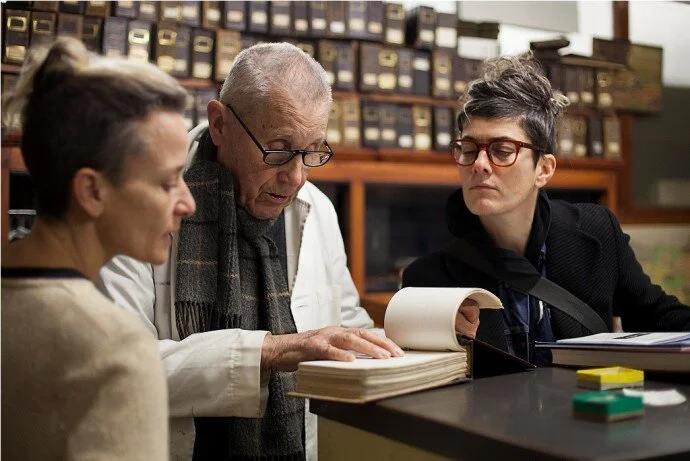 With collaborating artists Christina Schultz and Michaela Michalak in Footnote No. 4: Please be more specific (2016) presented by Lightning Studies at Museu Geològic del Seminari de Barcelona. Photo by Marzia Matarese. Image courtesy of Hangar.