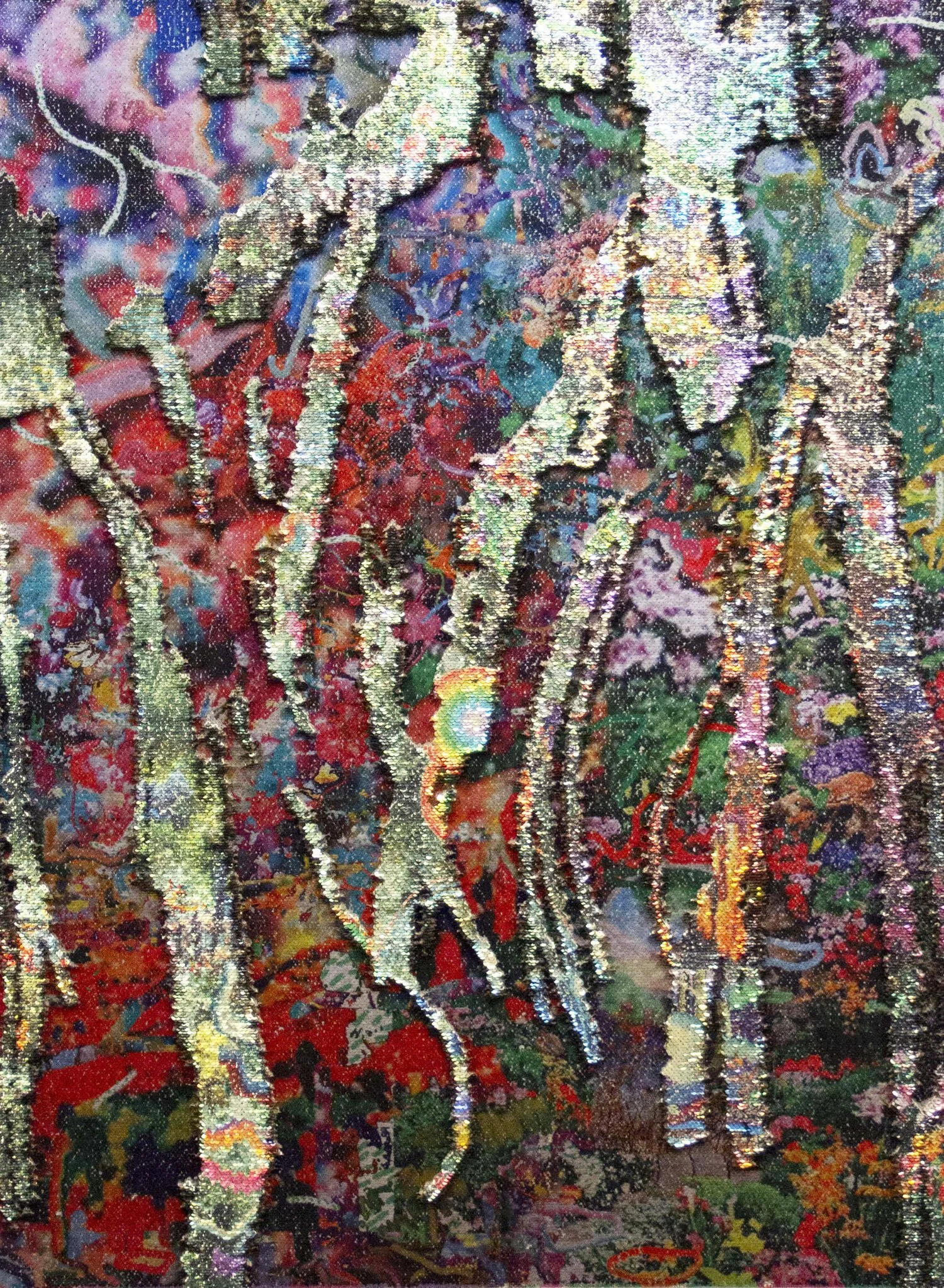 The digital quality was something I discovered after experimenting with this technique and it surprised me as well. I think it is one of the greatest things that can happen during one’s journey as an artist. I figured that the sequins’ effect is like a physical manifestation of the content of my art. It is a “liquid” form, always in movement with no fixed and rigid moment. It is a new space that opens in between these two polarities.