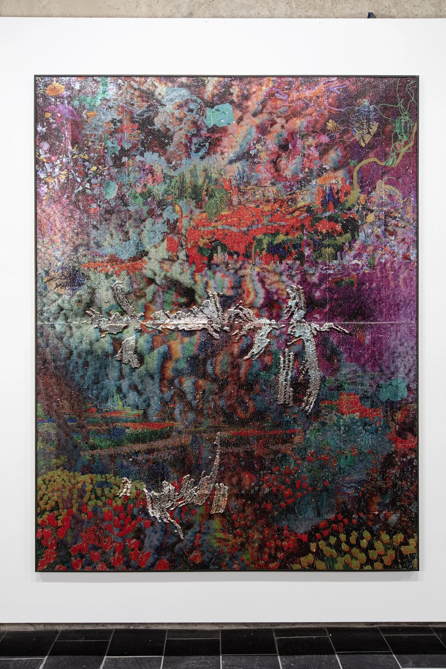 Olga Titus, no title, 2019, digital print on sequins mounted on fleece with wooden frame, 194 x 251 cm. Collection of Kunstmuseum Thurgau. Photo by Stefan Rohner.