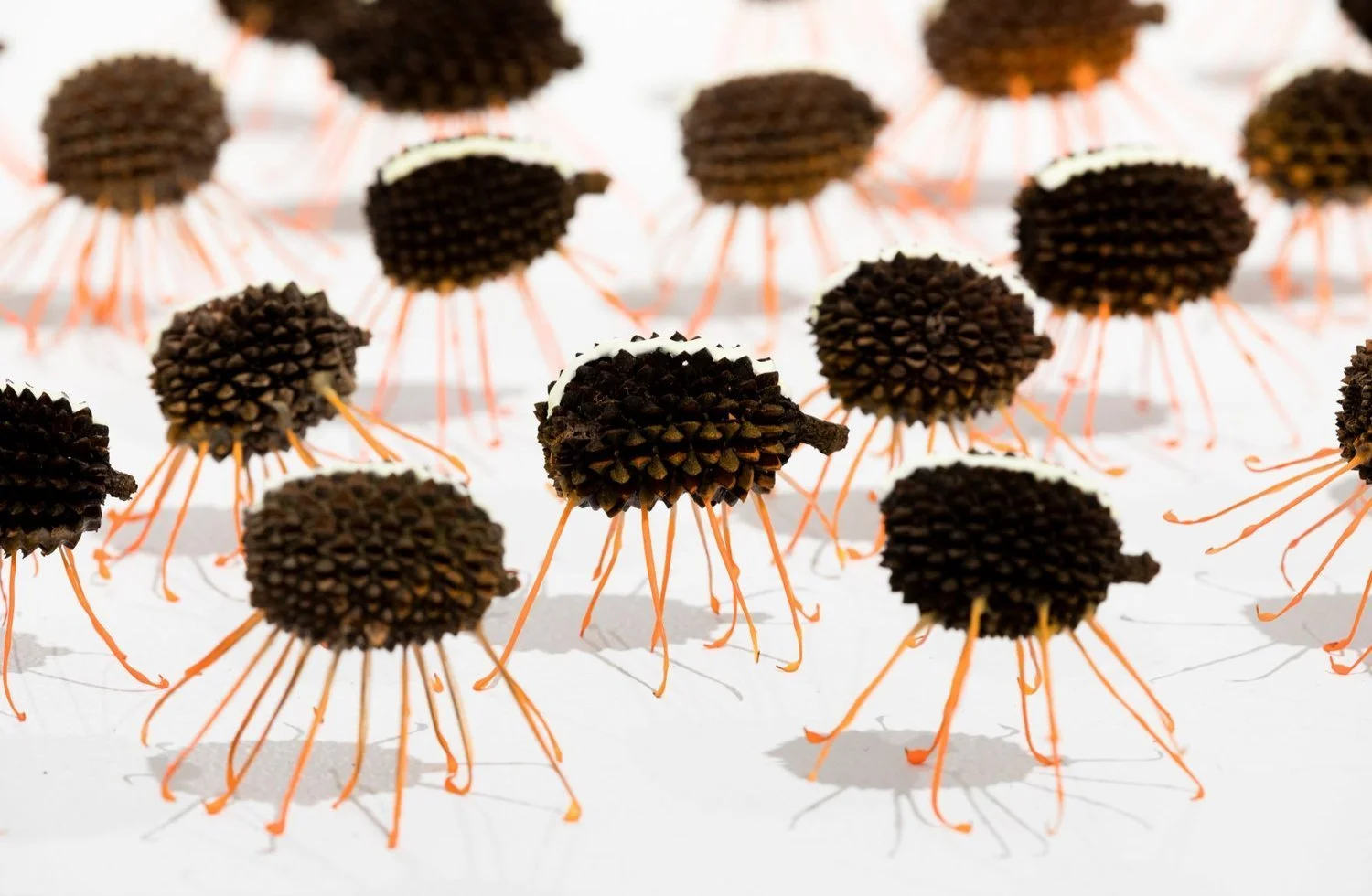 I was dreading recreating this work because on top of everything else that I had to do, I needed to make at least 1000 Buggies. It meant that I would have to glue thousands of “wiry styles” that protrude from the banksia flower into the cavities of the casuarina pods. This led to a kind of metamorphosis, where the seed pods became bodies and the styles became legs. It did not make much sense to me to recreate something made 28 years ago, so I modified the work. In retrospect, it was such an interesting process of modification. It makes me wonder if all my work is in a state of work-in-progress, even if there are elements in the work that are finished… Indeed, this is probably something the art market does not want to hear.