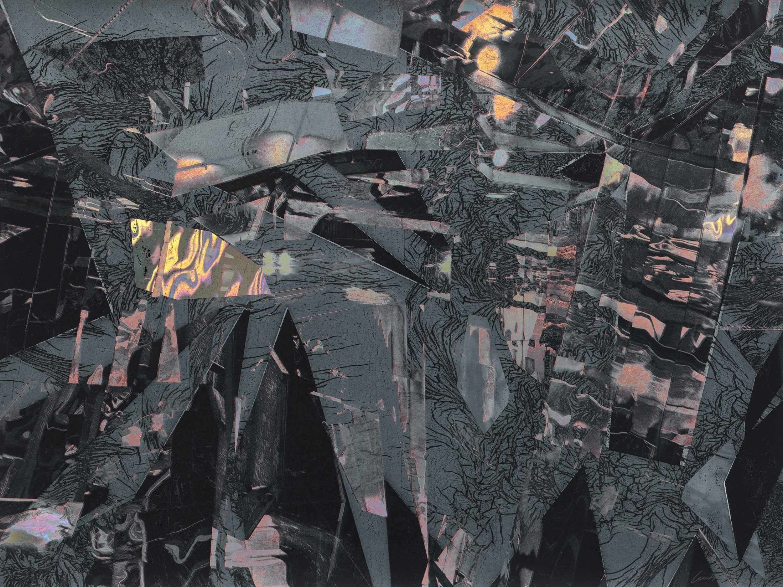 The clear mirror position is where we challenge the complete image of a historical narrative, or our surroundings and realities. This comes across in a conceptual and literal way, in the Untitled - SF series. Visually, the print reminds me of a broken black screen, or a shattered mirror. We all have the familiar references from everyday life, such as a broken iPhone screen, or the TV show ‘Black Mirror’ where the opening scene is like a shattered screen. The imagery also calls to mind the idea of navigating through the urban jungle, seeing lights reflected in the glass façade of high-rises.