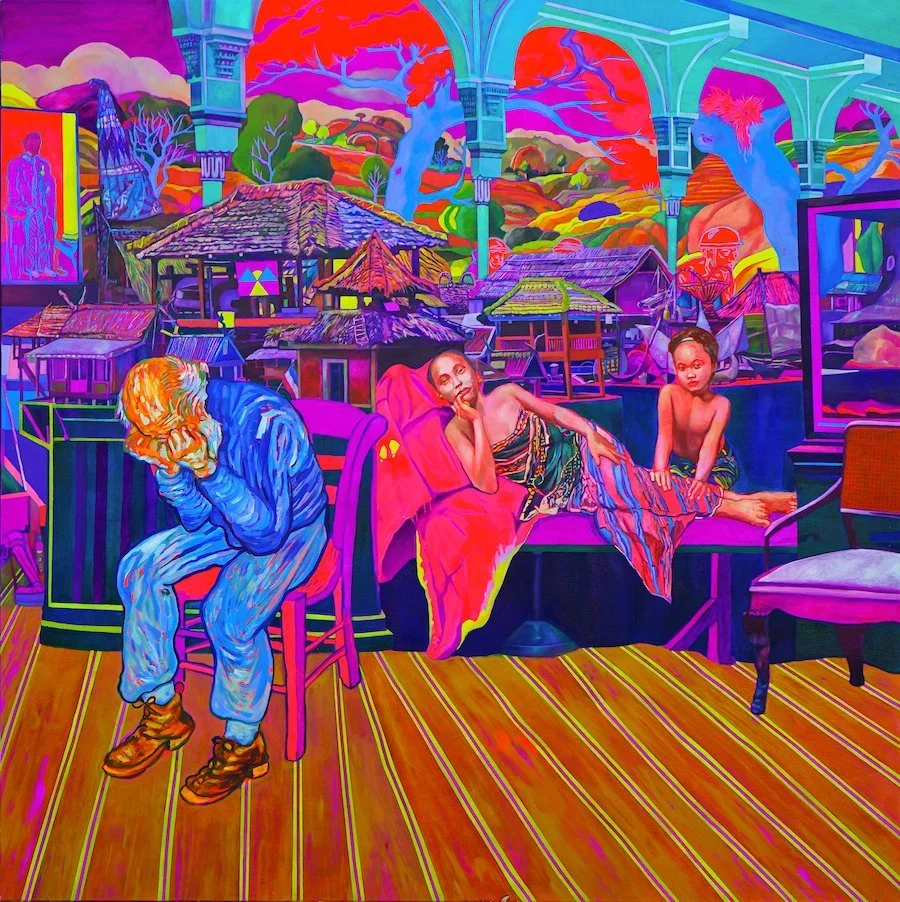 Zico Albaiquni, Go Tribal to Go Global to Go New Tribal, 2023, oil on canvas, 153 x 150cm. Image courtesy of the artist and Yavuz Gallery.