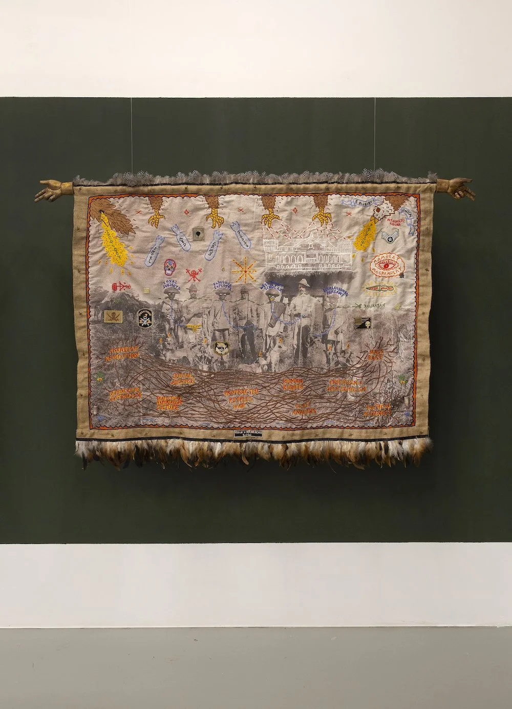 Cian Dayrit, Natural Histories of Struggle: Rhizome, 2021, objects, embroidery, imagery and digital print on fabric (collaboration with RJ Fernandez and Henricus), 120 x 180 cm. Image courtesy of Nome Gallery and B. Clarken.