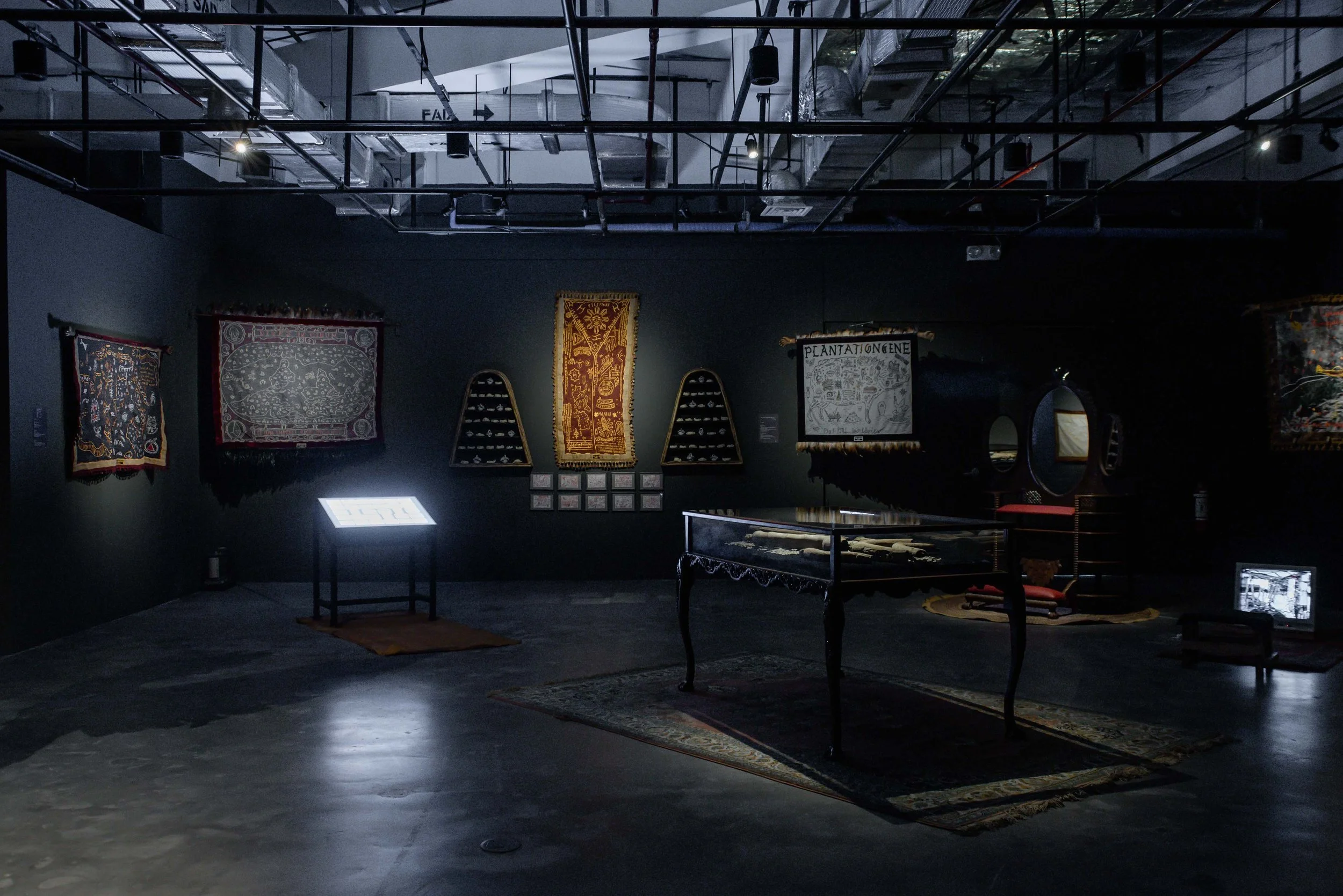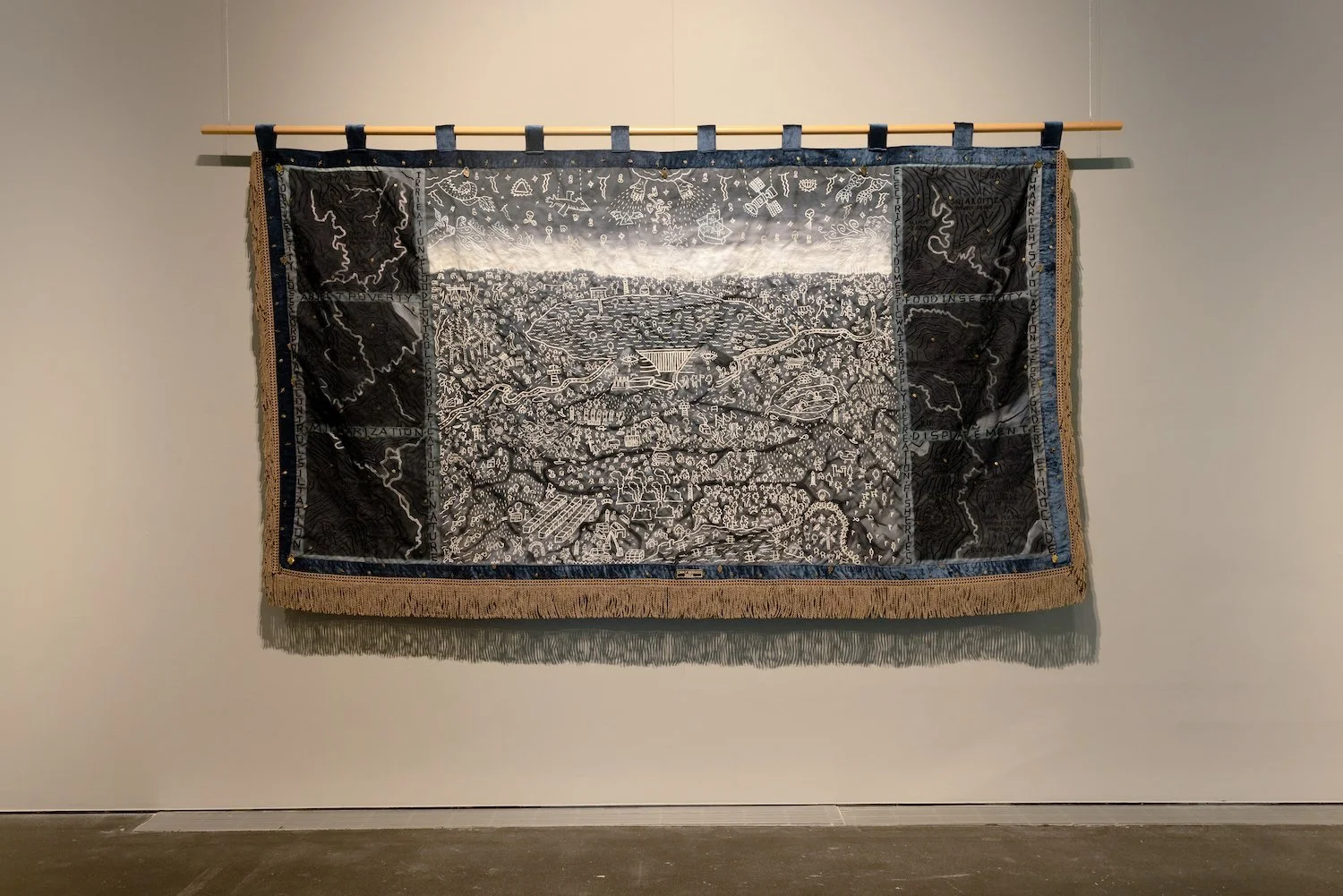 Cian Dayrit, Blueprint of Dam as Sadistic Monument, 2022, objects, embroidery and digital print on fabric. Image courtesy of Art Jameel.